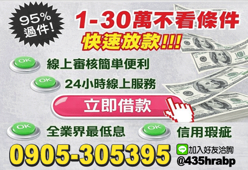 有工作即可申辦,信用小白、無薪轉、無勞保,立即申貸!台北借款、新北借貸、基隆借款請洽第一借錢網:0905-305395北部快速借款洽LINE:@435hrabphttps://168cash.com.tw/adv/detail/4881?area=taipei&cid=0