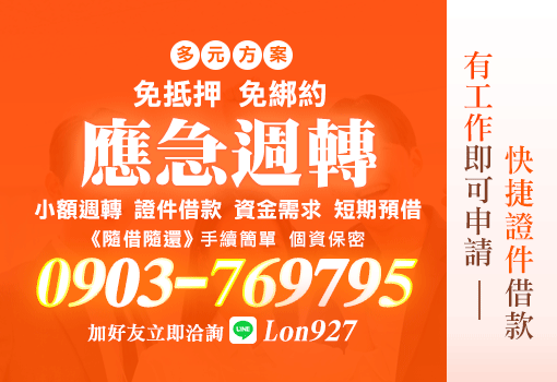 台北、新北、基隆地區專業應急週轉服務。提供小額證件借款、免抵押、免綁約,只要有工作即可申請!手續簡單、個人資料絕對保密,隨借隨還無壓力。急用錢不求人,立即撥打 0903-769795 或加 LINE: Lon927 洽詢。